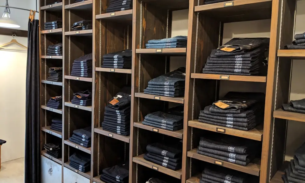 The store is known for its unique yarn dyeing process, which utilizes aizome indigo threads, resulting in distinctive fading patterns on each piece of denim.